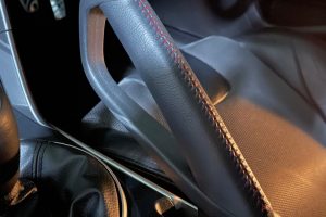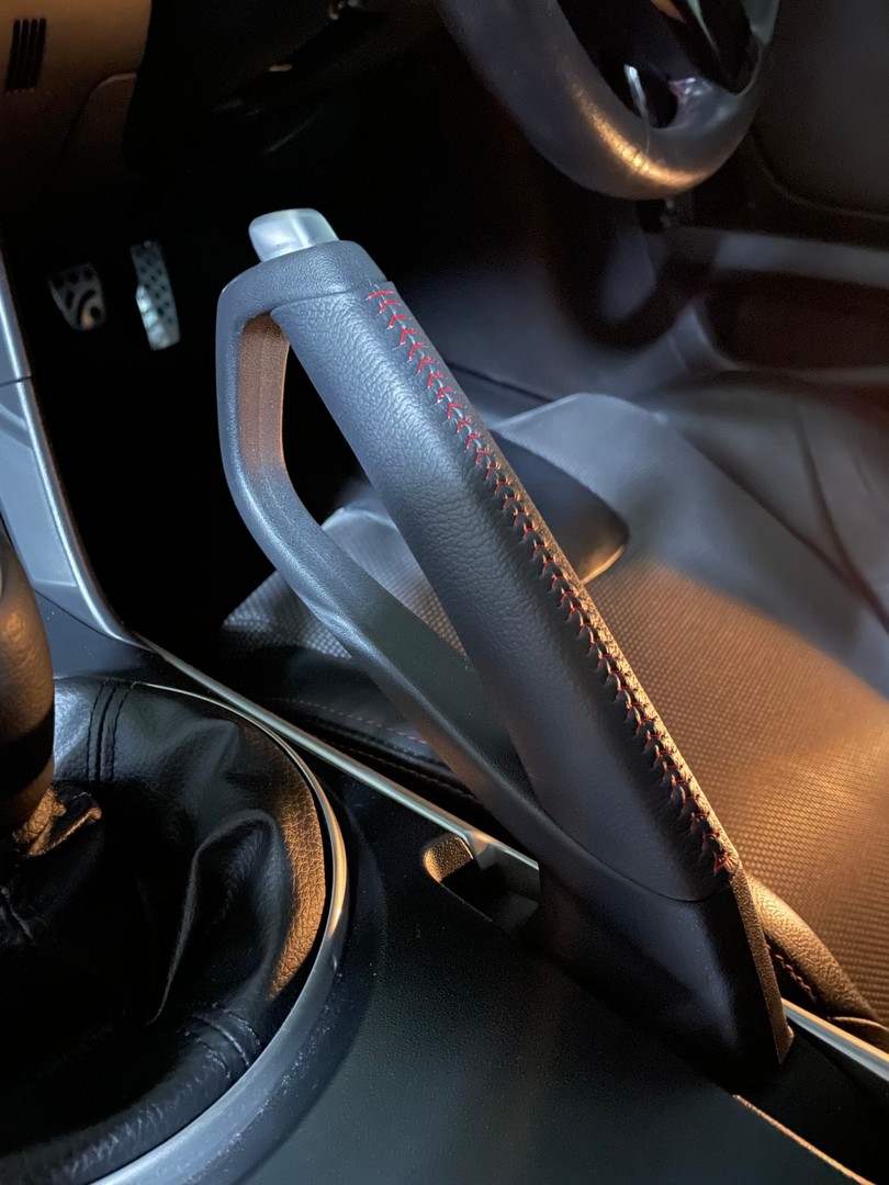 Handbrake lever with red stitching provides sporty styling with durable construction. Enhances interior aesthetics while ensuring reliable handbrake operation and comfortable grip.